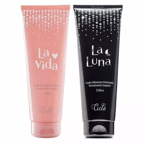Kit de Hidratantes Perfumados La Vida e La Luna reúne os hidratantes da Ciclo Cosméticos que, como irmãos, têm personalidades próprias que se complementam: La Vida tem uma fragrância delicada e luminosa como o dia, e La Luna é sensual e envolvente como a noite. Agora você tem um hidratante que expressa sua personalidade e sentimentos para cada momento do dia. La Vida Loção Hidratante Desodorante Corporal 240ml: La Vida loção hidratante é um hidratante envolvente, com formulação especialmente desenvolvida para ser rapidamente absorvida pela sua pele. Com sua fragrância delicada e luminosa, a loção hidratante corporal La Vida by Ciclo convida você a escrever sua própria história e viver uma vida muito mais feliz e perfumada. Sua fragrância traz notas de patchouli e íris. Hidrata e perfuma sua pele tornando sua vida mais bela. Encontre sua felicidade e seu caminho com a doce fragrância do hidratante corporal La Vida! O segredo da durabilidade da fragrância do hidratante La Vida está na superconcentração de essência da fórmula,garantindo pele macia e perfumada por mais tempo.A Fragrância:Notas de Saída: Pêra, Cassis, FramboesaNotas de Corpo: Íris, Jasmim, Flor de LaranjeiraNotas de Fundo: Pralinê, Patchouli, Baunilha, Fava TonkaLa Luna Loção Hidratante Desodorante Corporal 240ml: La Luna loção hidratante é um hidratante envolvente, com formulação especialmente desenvolvida para serrapidamente absorvida pela sua pele. Comuma fragrância oriental gourmet afrodisíaca, marcante e sedutora, o hidratantecorporal La Luna é perfeito para mulheres misteriosas e envolventes como uma noite de luar. Associa notas de pêra, rosa, pralinê e orquídea, desperta sensualidade e feminilidade ao mesmo tempo em que é marcante e encantador. La Luna hidratante é uma chuva de estrelas, sensual e romântico como a noite! La Luna hidratante corporal tem uma fragrância com personalidade própria. Como irmãos, La Vida e La Luna são diferentes e têm personalidade própria, mas se completam. Agora você tem um hidratante para cada hora do seu dia: La Vida para o dia, La Luna para a noite! O segredo da durabilidade da fragrância do hidratante La Luna está na superconcentração de essência da fórmula, garantindo pele macia e perfumada por mais tempo.A Fragrância:Notas de Saída: Pêra, Bergamota, TangerinaNotas de Corpo: Rosa, Orquídea, Baunilha, Maracujá, MorangoNotas de Fundo: Baunilha, Lichia, Caramelo, Patchouli, Pralinê Todos os dados desta descrição foram informados pelofabricante / fornecedor do produto. A imagem ilustra o produto no momento que foi cadastrado,podendo ser alterada pelo fabricante sem prévio aviso.