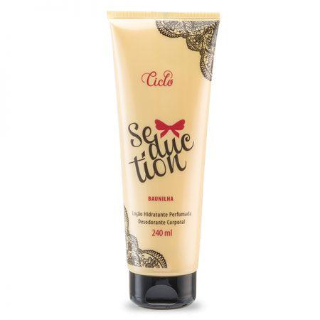 Seduction Baunilha Loção Hidratante Corporal Perfumada 240ml Ciclo CosméticosO hidratante de rápida absorção Seduction Baunilha possui uma fragrância de arrancar suspiros, hidrata e cuida da sua pele, deixando um delicioso e sedutor perfume. O segredo da durabilidade da fragrância da loção hidratante Seduction Baunilha está na superconcentração de essência da fórmula, garantindo pele macia e perfumada por mais tempo. A Fragrância:Notas de cabeça: abacaxi, orquídeaNotas de corpo: íris, jasmim, guaiaco, tuberosaNotas de fundo: musk, fava tonka, baunilha, carameloModo de usar: Aplicar na pele seca, em movimentos circulares, espalhando até completa absorção, especialmente após o banho.Indicado para todos os tipos de pele. Uso diário.